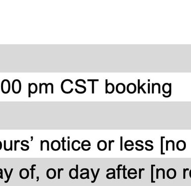 Eight (8) hours’ advanced notice for booking cancellation is required. Cancellation should be made by call or text to 469.213.8760 or email to ServiamPreferred@pm.me.