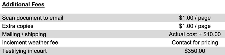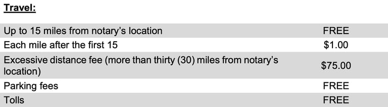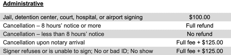 All appropriate fees for requested notarial acts listed above will be charged in addition to all appropriate fees from each of the category lists below. These fees are neither required nor specified in the law and are completely separate from fees for notarial acts.