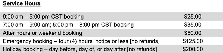 There will be no refunds for cancellations made with less than eight (8) hours’ notice or for emergency or holiday bookings.